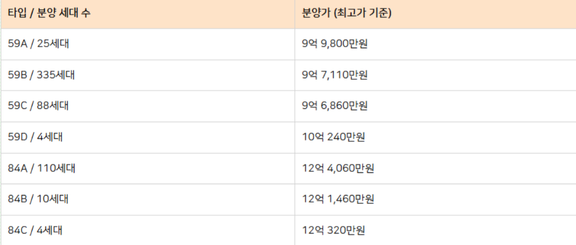 전체적으로 합리적인 가격대로 책정되어 있으며, 84㎡ 타입은 특별공급도 존재합니다.